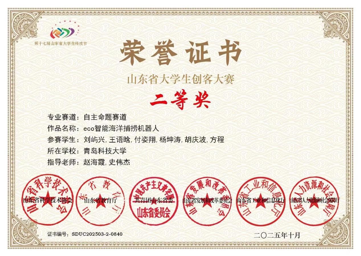 2025,山东省大学生创客大赛获二等奖:ECO智能海洋捕捞机器人