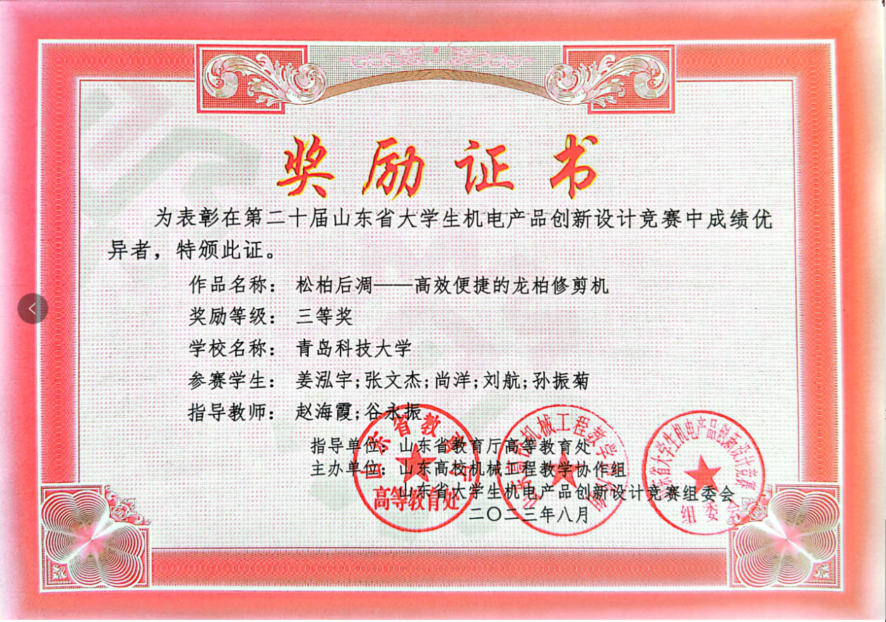 2023,第二十届山东省大学生机电产品创新设计竞赛三等奖:松柏后凋-高效便捷的龙柏修剪机