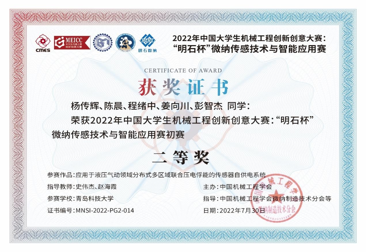2022,中国大学生机械工程创新创意大赛—“明石杯”第三届微纳传感技术与智能应用赛初赛二等奖:应用于液压气动领域分布式多区域联合压电俘能的传感器自供电系统