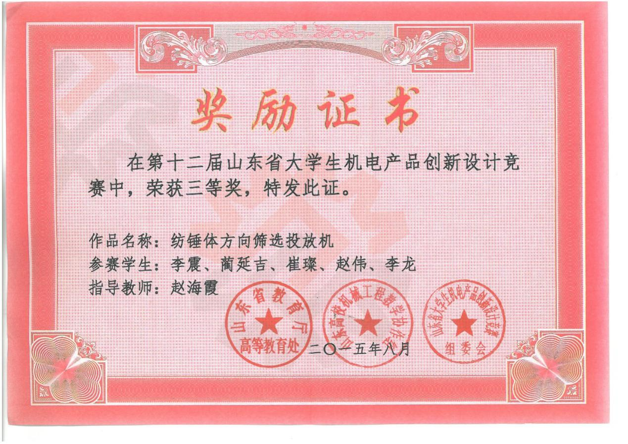 2015,第十二届山东省大学生机电产品创新设计竞赛获三等奖:纺锤体方向筛选投放机