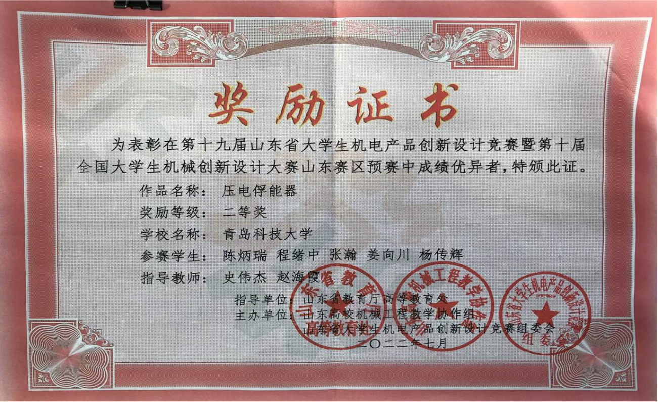 2022,第十九届山东省大学生机电产品创新设计竞赛获得二等奖:压电俘能器