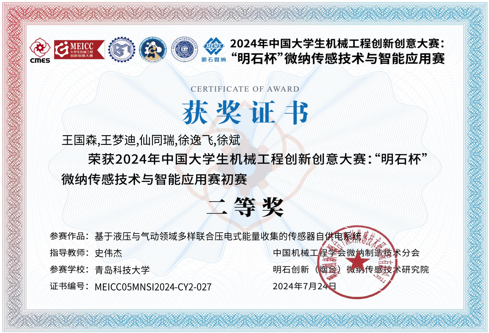 2024,中国大学生机械工程创新创意大赛“明石杯”微纳传感技术与智能应用赛初赛二等奖基于液压与气动领域多样联合压电式能量收集的传感器自供电系统