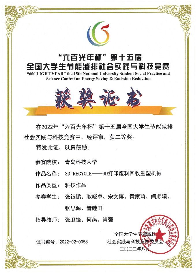 2022,第十五届全国大学生节能减排社会实践与科技竞赛 国家级二等奖